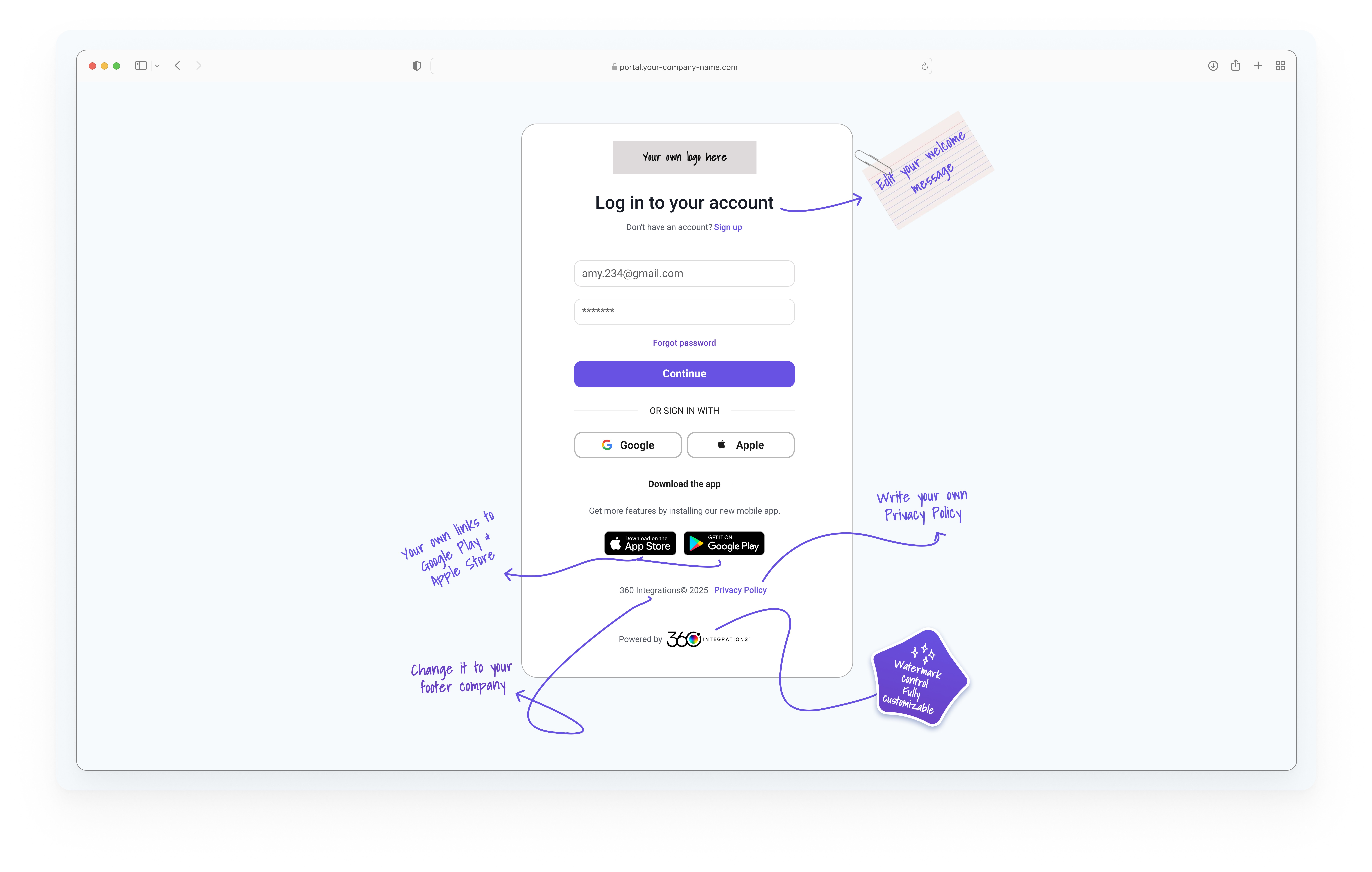 Everything your clients see is under your brand, not ours. When a client receives a login code, a notification, or an e-signature request, it all comes from your business name and your email, never 360io. In the App Store, your clients download your app with your name and your branding, and all communication inside the app matches your identity. You fully control the experience — from the logo to the colors to the content. 360io simply powers the technology behind the scenes, while you own the app, the brand, and the relationship 100%.